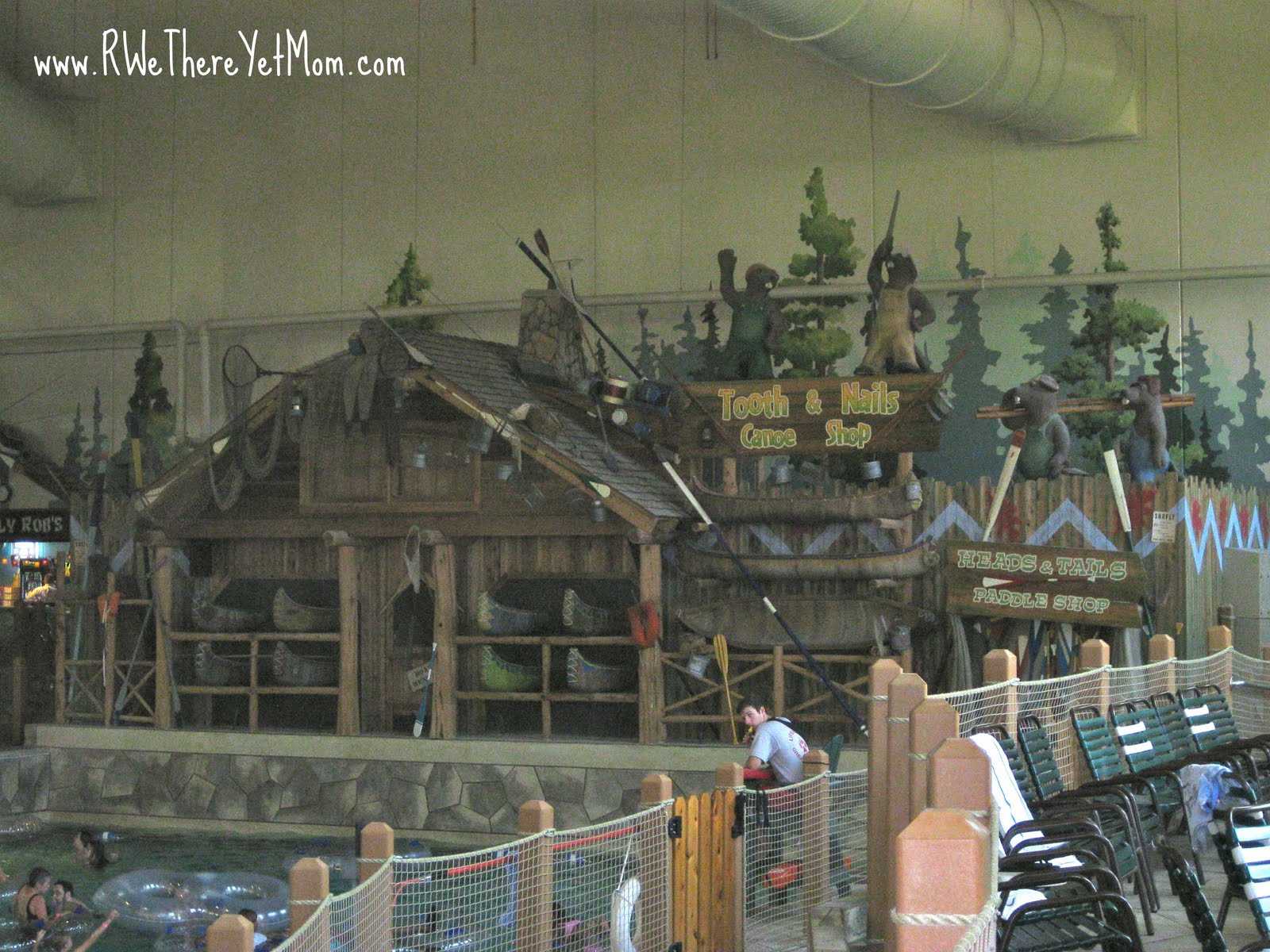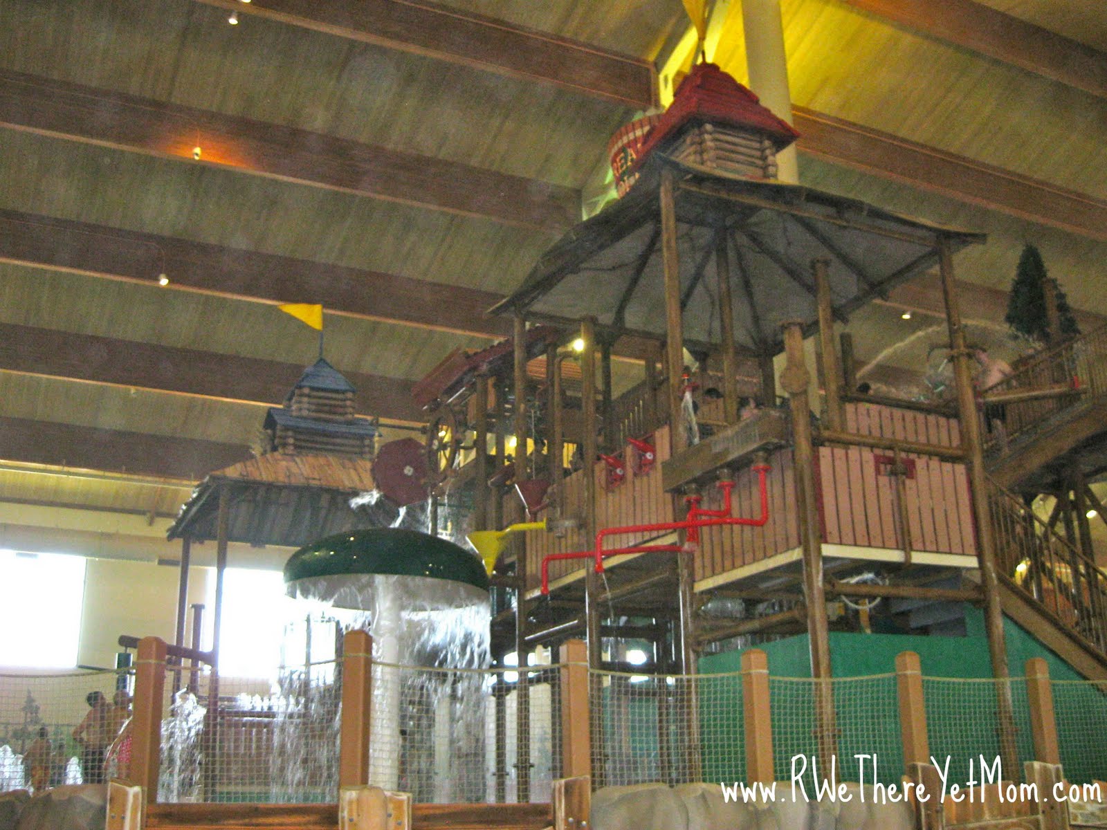 The water park itself is mainly indoors. This is a huge benefit to those who sunburn easily. There are five large slides inside and two smaller ones located outside. Upon entering the park there is a large play area, Fort Mackenzie and Totem Towers. This area is designed as a huge tree house that has water cannons that fire down onto folks floating in the lazy river, two slides, springs that shoot out of the ground, buckets that dump etc. It also has one HUGE bucket that dumps approximately 1000 gallons of water onto onlookers every ten minutes or so. This is a good area to let the kids run around and play. There are areas surrounding it where a parent can sit and watch or you can play with them. These two slide are rated at up to 400 pounds.