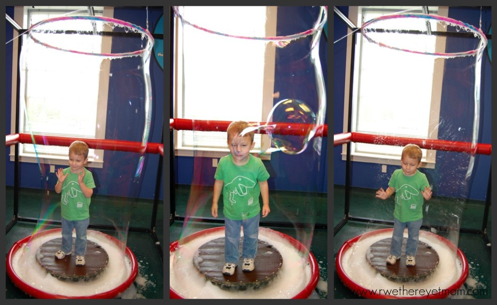 But our absolute favorite room? The Bubble Room! All 3 kids got to see what the “inside” of a bubble was like as they crated bubbles around themselves. They attempted to try to blow the biggest bubbles they could. At one point, we had a crowd working together to blow a big one. It was fantastic.