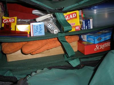 Those green canvas bags are perfect for storing paper products, plastic baggies, silverware, etc. There is a list for these as well and then they are ready to go for next year too.