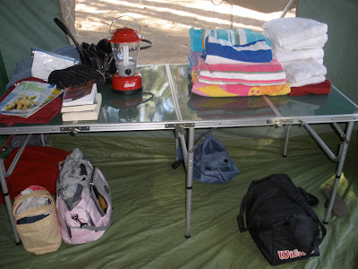 I also cannot stand to be unorganized as far as clothes, sundries, towels, etc. In the “front” room of the tent I set up a table and unpack on top of that.