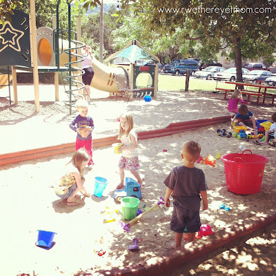 I was able to drink my ice tea and have a delicious cheeseburger (yes, I indulged!) while my guy ran around the sand pit and playscape for 2 hours. He made new friends, played with trucks, climbed up & down the playscape, and barely came over to get a drink.